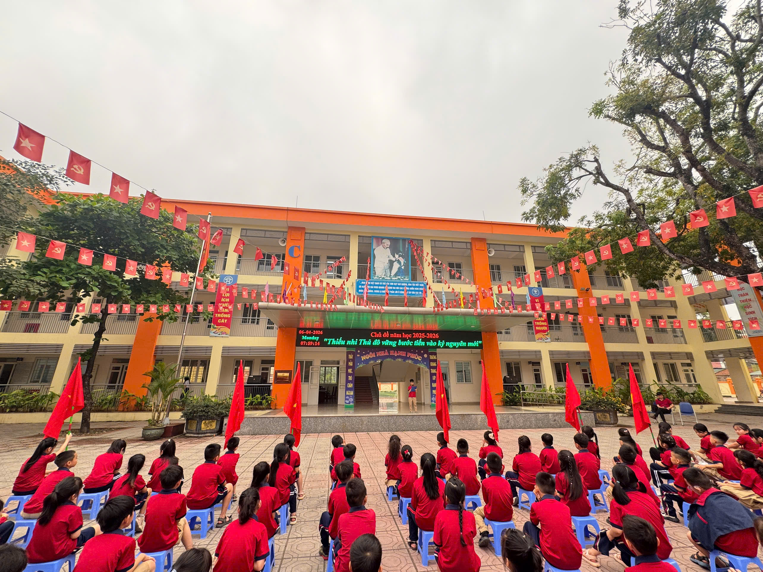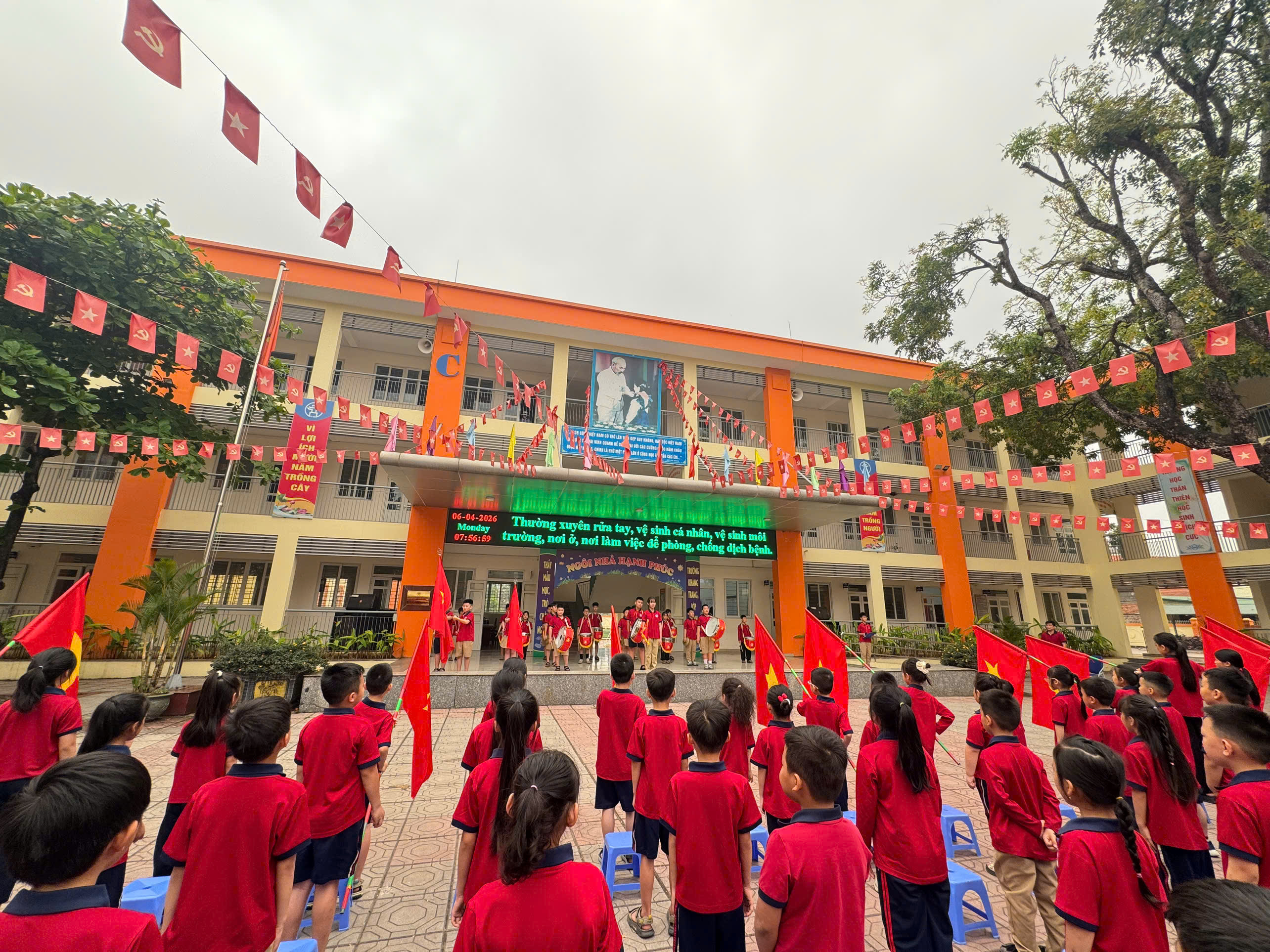 Mở đầu buổi lễ là nghi thức chào cờ trang trọng. Toàn thể cán bộ, giáo viên và học sinh nhà trường cùng hát Quốc ca với tinh thần nghiêm túc, thể hiện lòng tự hào dân tộc.