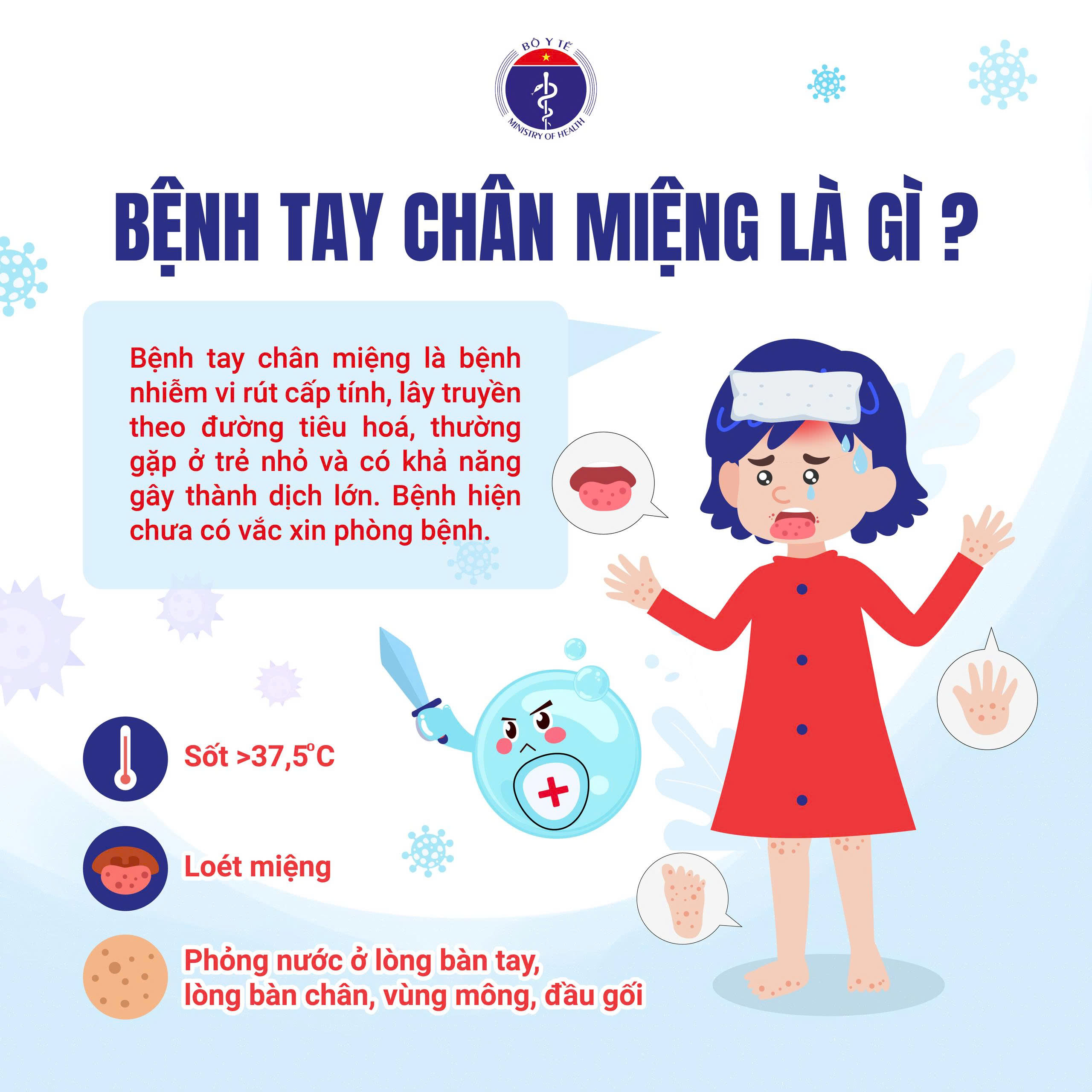 Hiện nay bệnh tay chân miệng đang có xu hướng gia tăng và dễ lây lan trong môi trường học đường. Bệnh thường có các dấu hiệu như: sốt, loét miệng, nổi phỏng nước ở tay, chân, mông.